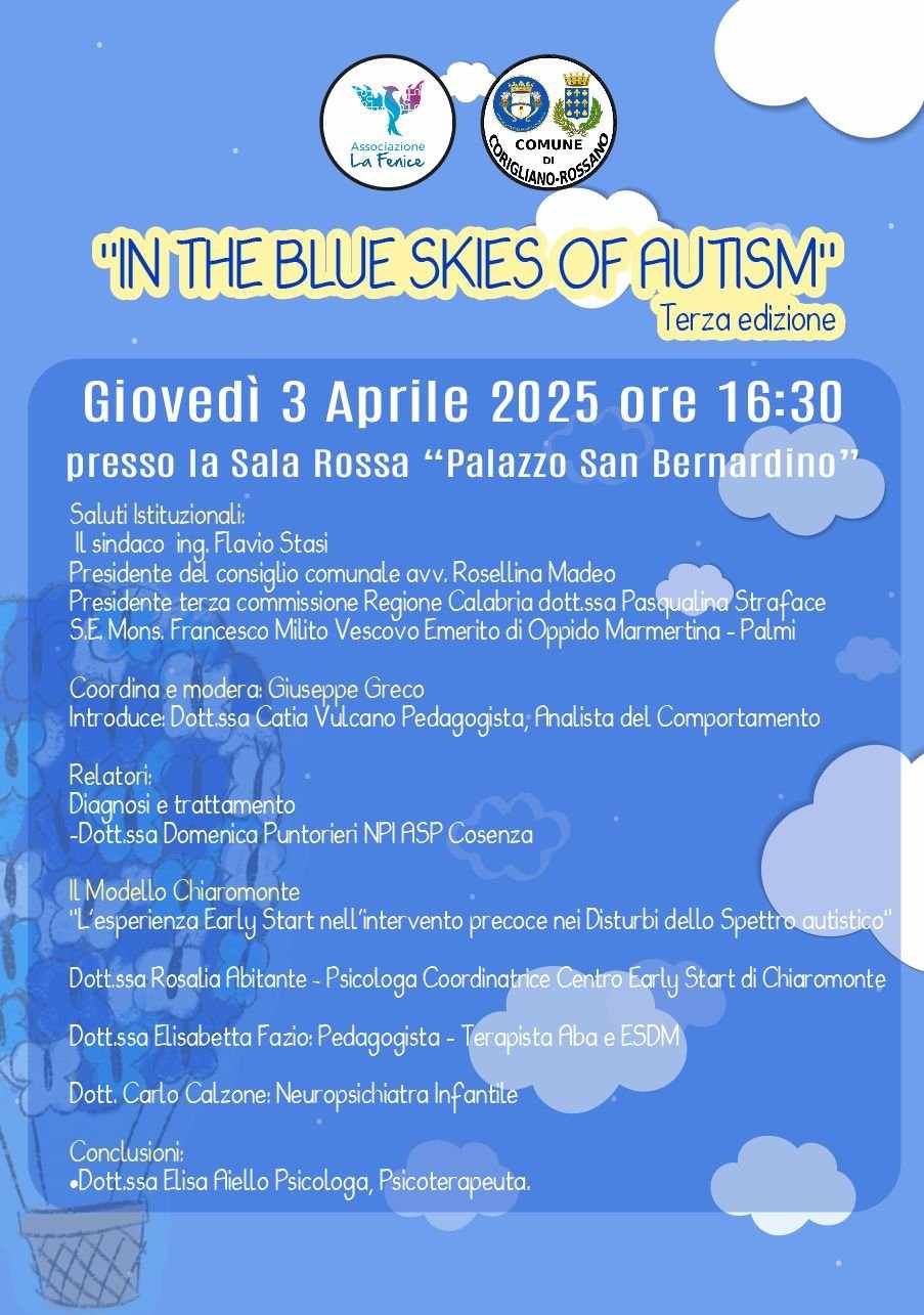 Siamo giunti alla III edizione del convegno “In the bue skies of Autism”, organizzato dall’Associazione “La fenice” in occasione della giornata mondiale della “Consapevolezza sull’Autismo”, che si terrà il 3 Aprile alle ore 16.30 presso la Sala Rossa “Palazzo San Bernardino”.
