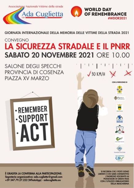 In occasione della Giornata Mondiale della Memoria delle vittime della strada, sabato 20 Novembre 2021 alle ore 10.00 presso il Salone degli Specchi della Provincia di Cosenza si terrà il convegno pubblico dal titolo “La sicurezza stradale ed il Pnrr” organizzato dall’associazione “Ada Cuglietta” odv