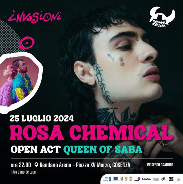 Rosa Chemical, nome d’arte di Manuel Franco Rocati, noto per il suo stile unico, le sue canzoni “provocatorie”, il linguaggio non convenzionale. Nel 2023, la partecipazione a Sanremo con il brano “Made in Italy” che ha ottenuto il doppio disco di platino. E ancora: “Bellu guaglione”, “Black out”, e a giugno l’uscita del singolo “3some” in collaborazione con Villabanks. Intro affidata a Dario De Luca.