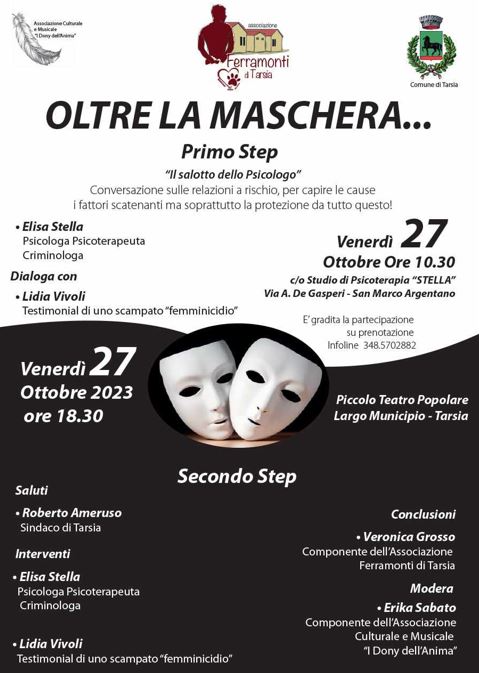 “I Dony dell’Anima” e “Associazione Ferramonti di Tarsia”, in collaborazione con l’Amministrazione Comunale di Tarsia e in partnership con lo “Studio di Psicologia e Psicoterapia Stella”, presentano “Oltre la Maschera”, evento dedicato al tema della violenza sulle donne
