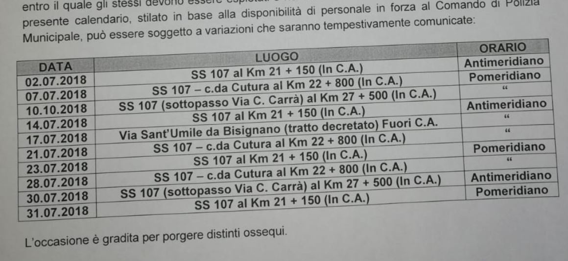 “Pianificazione dei servizi di controllo elettronico della velocità mediante l’utilizzo di apparecchiatura ‘Autovelox’ – Luglio 2018”