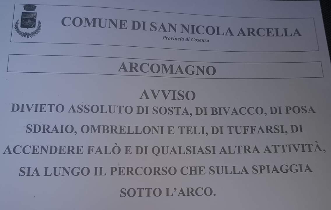 Queste sono le disposizioni per l’Arcomagno contenute nell’avviso del comune affisso sul posto che Italia Nostra condivide (divieto assoluto di sosta, di bivacco, di posa sdraio, ombrelloni e teli, di truffarsi, di accendere falò…..), ma i risultati sono quelli che si vedono nella foto allegata dell’Arcomagno: NESSUNO LE OSSERVA.
