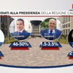 “Secondo la proiezione di Opinio Rai Roberto Occhiuto (centrodestra) è dato al 52.9%, Amalia Bruni (centrosinistra) 25.6%, Luigi de Magistris (Polo civico) 19.4%, Oliverio 2.1%”