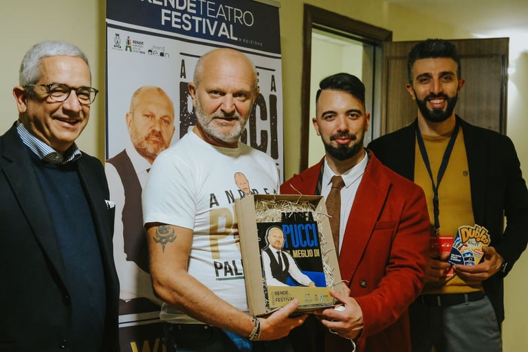 A fine spettacolo inoltre, il Sindaco Marcello Manna insieme al direttore artistico De Luca, hanno consegnato il premio Rende Teatro Festival come migliore artista della kermesse. Grande gesto di solidarietà a fine spettacolo quando lo stesso Pucci devolve l’incasso dei suoi CD con la band alla nota Associazione OncoMed di Cosenza (che si occupa della cura di malati oncologici).