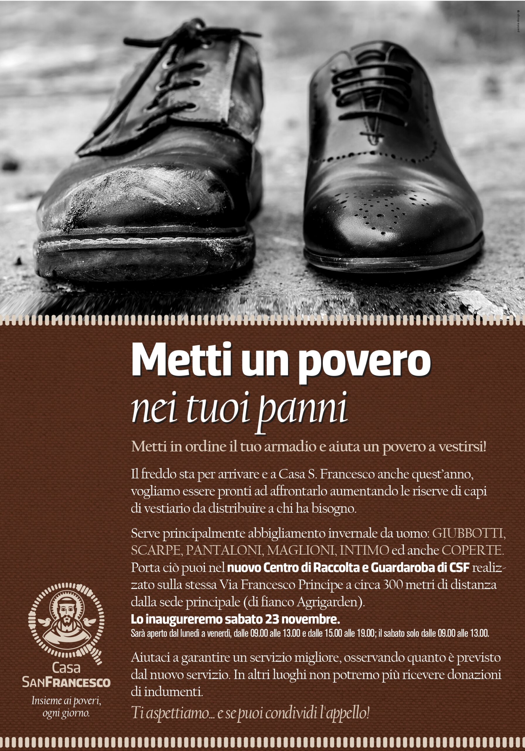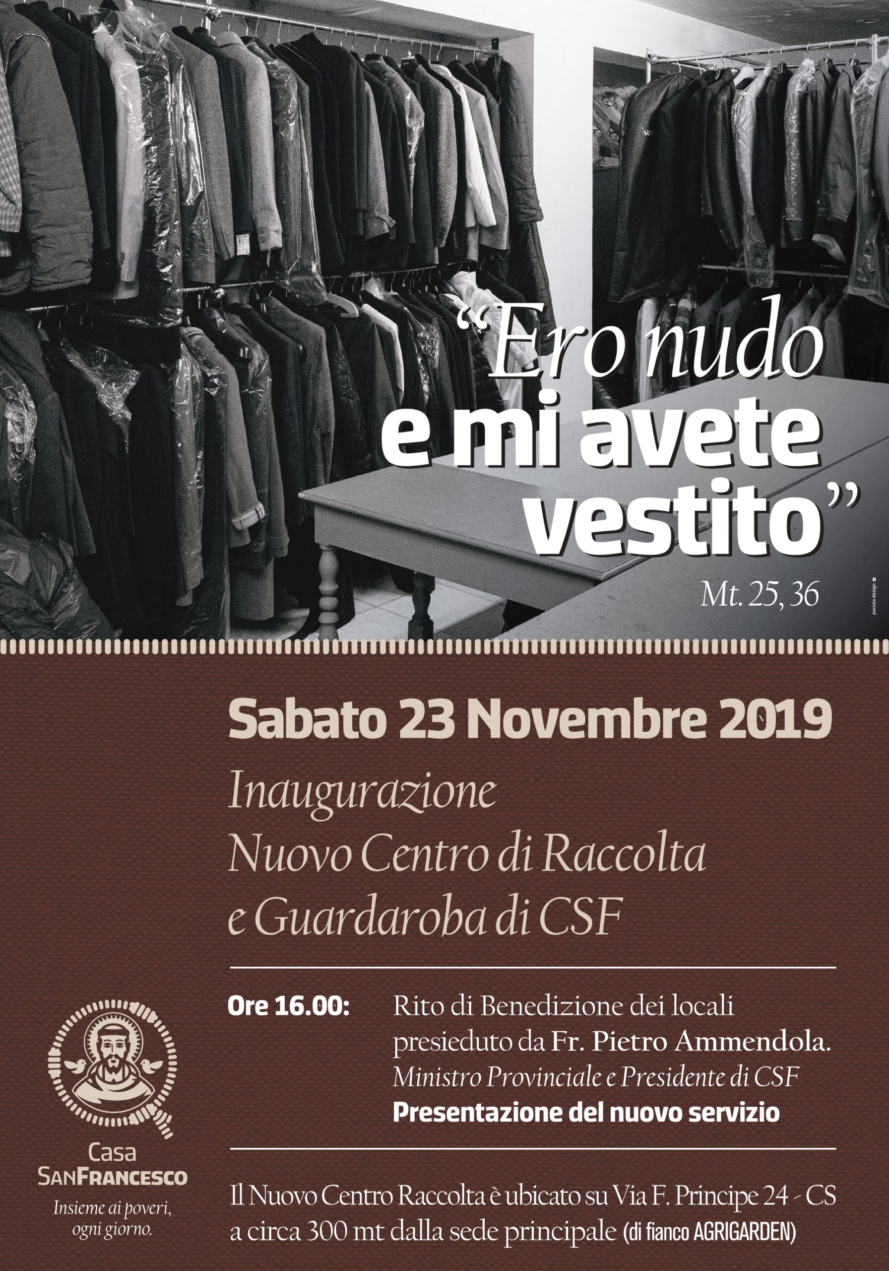 Sabato 23 novembre alle ore 16.00 la Fondazione Casa S. Francesco d’Assisi dei Frati Cappuccini di Cosenza, inaugurerà il nuovo Centro di raccolta e distribuzione degli indumenti “Ero nudo e mi avete vestito”.