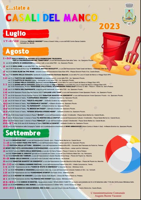 Quest’anno il cartellone degli eventi estivi del Comune di Casali del Manco è ricco e articolato. Ad annunciarlo sono il Sindaco, Francesca Pisani, e l’Assessore con delega alla Cultura, Giulia Leonetti, insieme con tutta l’Amministrazione comunale