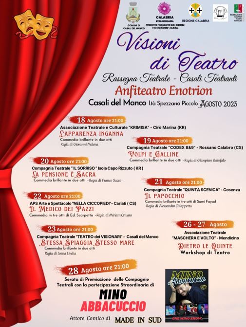 Queste risorse consentiranno di organizzare otto spettacoli – a partire dal prossimo 18 agosto – promossi dalla compagnia “Il teatro dei Visionari” e con la partecipazione di diverse compagnie provenienti da più parti della Calabria.