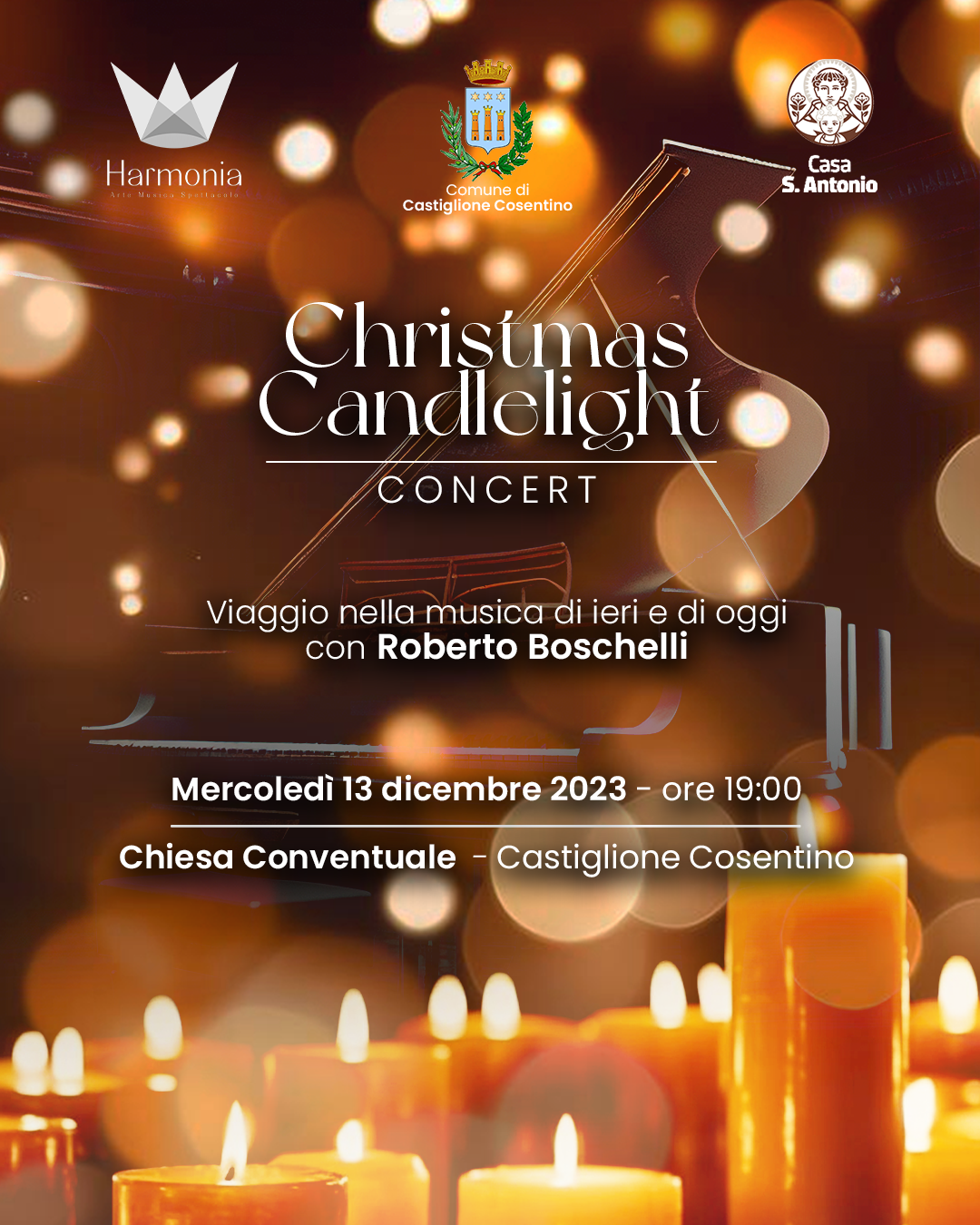 Evento di musica straordinario oggi martedì 12 dicembre 2023 alle ore 19:00, avrà luogo il “Christmas Candlelight – viaggio tra il romanticismo e il contemporaneo”, nella suggestiva location della chiesa seicentesca di S. Antonio, nel complesso conventuale di Castiglione Cosentino