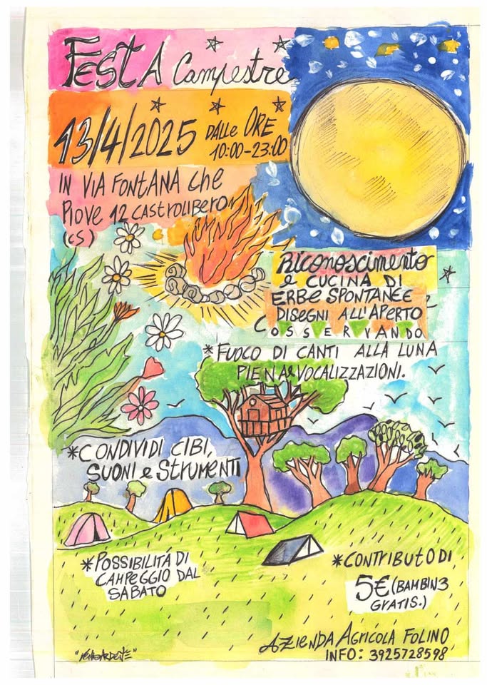 “Una giornata campestre, in mezzo alla natura, in cui verranno organizzate diverse attività, come la passeggiata e raccolta erbe spontanee, riconoscere e cucinare queste insieme, condivisione di cibo e bevande (con una quota di partecipazione di €5), pranzo comunitario (ognuno porta qualcosa) ed al tramonto si fara il fuoco con possibilità d suonare, cantare e ballare!!! E c’è anche la possibilita di campeggio gratis!”