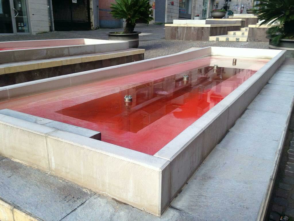«In occasione della festa delle donne – si legge in una nota -abbiamo deciso di far svegliare il centro della nostra città vetrina con due azioni: le fontane di via Arabia sono diventate rosse come il sangue delle donne uccise per quello che, troppo spesso, è stato definito amore.”