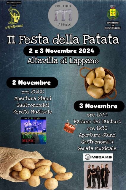 Non perdere l’occasione di vivere un weekend all’insegna del gusto, della musica e della convivialità. Ti aspettiamo ad Altavilla di Lappano il 2 e 3 novembre per la Festa della Patata: un evento che celebra la tradizione e l’ospitalità calabrese in un’atmosfera di festa e condivisione!