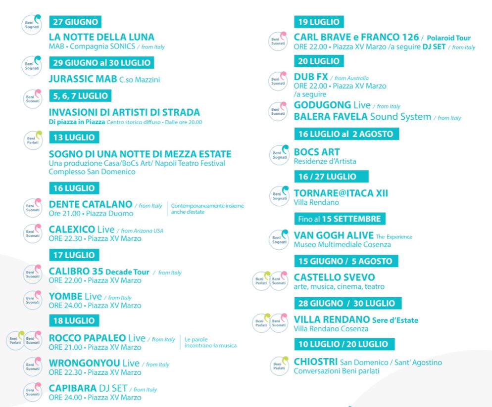 “Tre giornate nel centro storico di Cosenza, dal 5 al 7 luglio, tra passeggiate nei vicoli, acrobazie aeree, equilibrismo, spettacoli col fuoco, giocoleria, mimo, clowneria, animazione itinerante, trampoleria, statue viventi, musicisti di strada e molto altro ancora. Attività e spettacoli totalmente gratuiti, per coinvolgere grandi e piccini. Di piazza in piazza si muoveranno gli artisti nazionali ed internazionali e daranno vita ad uno spettacolo itinerante di arte e magia.