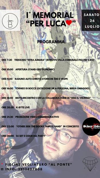 Non mancheranno momenti di divertimento e aggregazione con tornei vari, pensati per coinvolgere tutte le età. La musica dal vivo con i K-byte che apriranno la serata e la cover band ufficiale dei “The Doors” – gruppo musicale amato da Luca – e un DJ set accompagneranno l’intera manifestazione, creando un’atmosfera di condivisione e allegria, proprio come Luca avrebbe voluto.