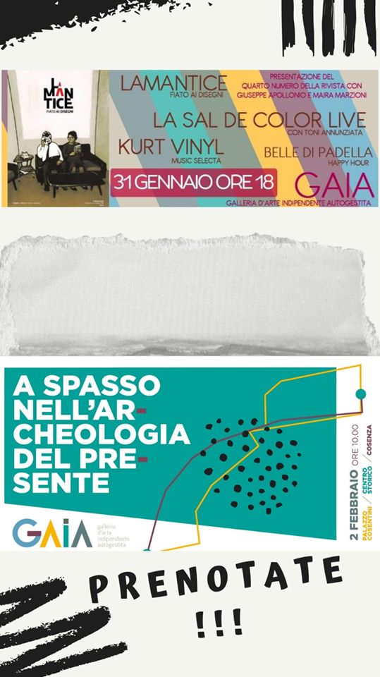 “Venerdì 31 ore 18:00 Appuntamento da Gaia | Lamantice La Sal de Color Kurt Vinyl per presentare la rivista Lamantice_mag con Giuseppe Apollonio e Maira Marzioni con i colori di Toni Annunziata e con la selezione musicale di Kurt Vinyl Domenica 2 ore 10:00 Le passeggiate di GAIA | A spasso nell’archeologia del presente con la visita guidata di Claudia Coppola Mella Riminizzo e il brunch delle Belle di padella.”