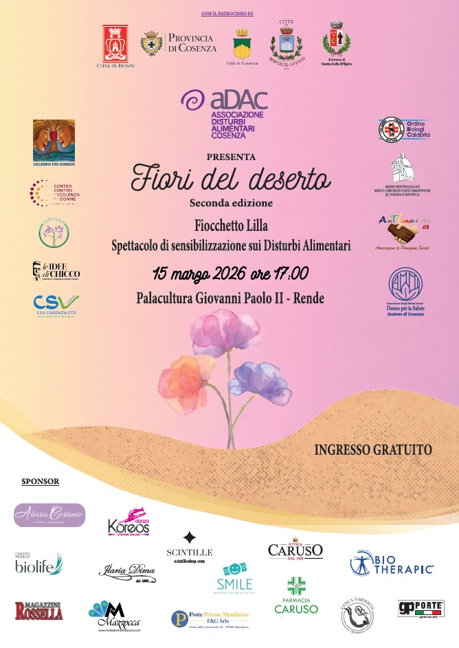 Un momento di arte, riflessione e sensibilizzazione per raccontare una realtà spesso invisibile. Domenica 15 marzo 2026, alle ore 17:00, il Palacultura “Giovanni Paolo II” di Rende ospiterà la seconda edizione dello spettacolo “Fiori del deserto”, evento dedicato alla sensibilizzazione sui disturbi del comportamento alimentare e organizzato dall’associazione ADAC – Associazione Disturbi Alimentari Cosenza. L’iniziativa si inserisce nel calendario di appuntamenti legati alla Giornata Nazionale del Fiocchetto Lilla, ricorrenza che richiama l’attenzione pubblica su queste patologie e promuove informazione, prevenzione e lotta allo stigma.