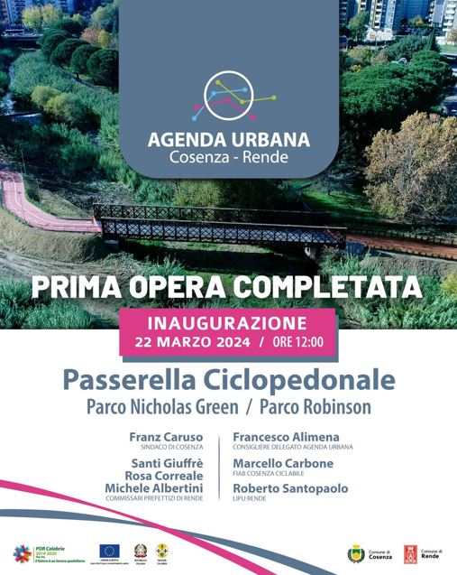 Sarà inaugurata venerdì 22 marzo, alle ore 12,00, la passerella ciclopedonale che sancirà ufficialmente l’unione dei due parchi urbani (il “Nicholas Green” e il “Robinson”) appartenenti rispettivamente ai Comuni di Cosenza e di Rende