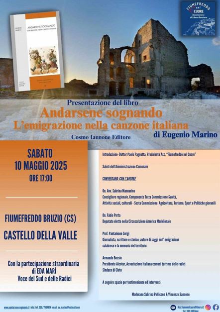 Il prossimo 10 maggio, presso il Castello della Valle di Fiumefreddo Bruzio, presentazione dell’opera: “Andarsene sognando. L’emigrazione nella canzone italiana” di Eugenio Marino