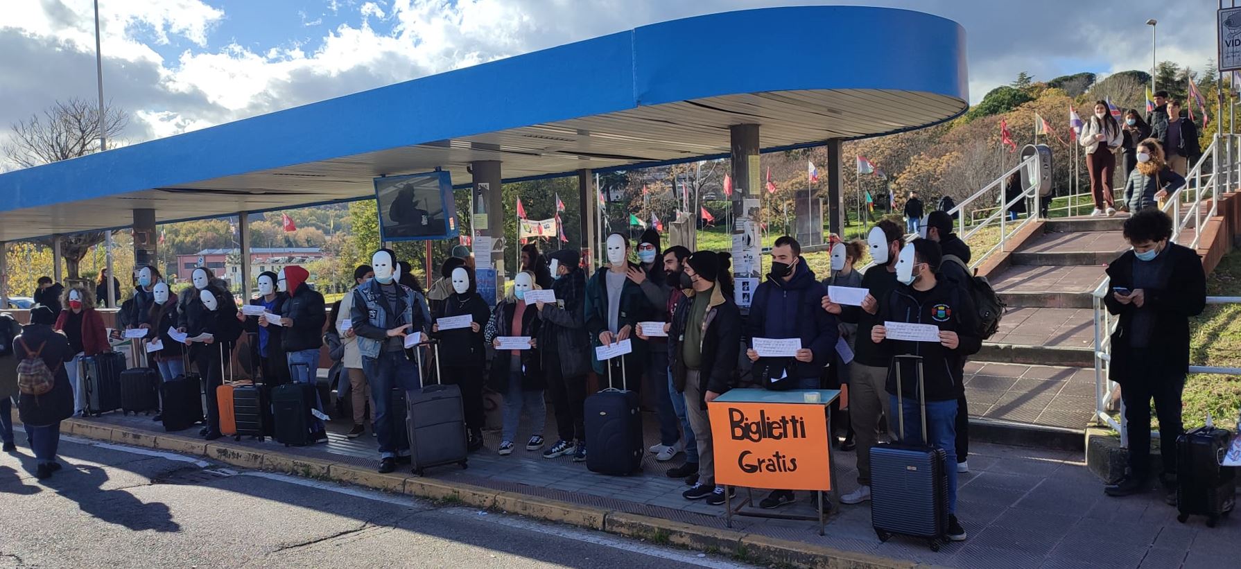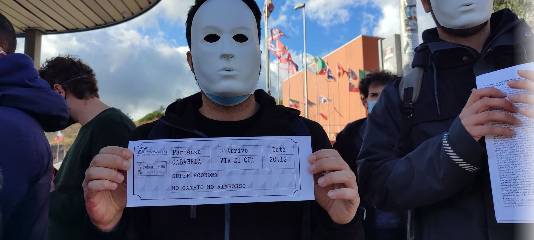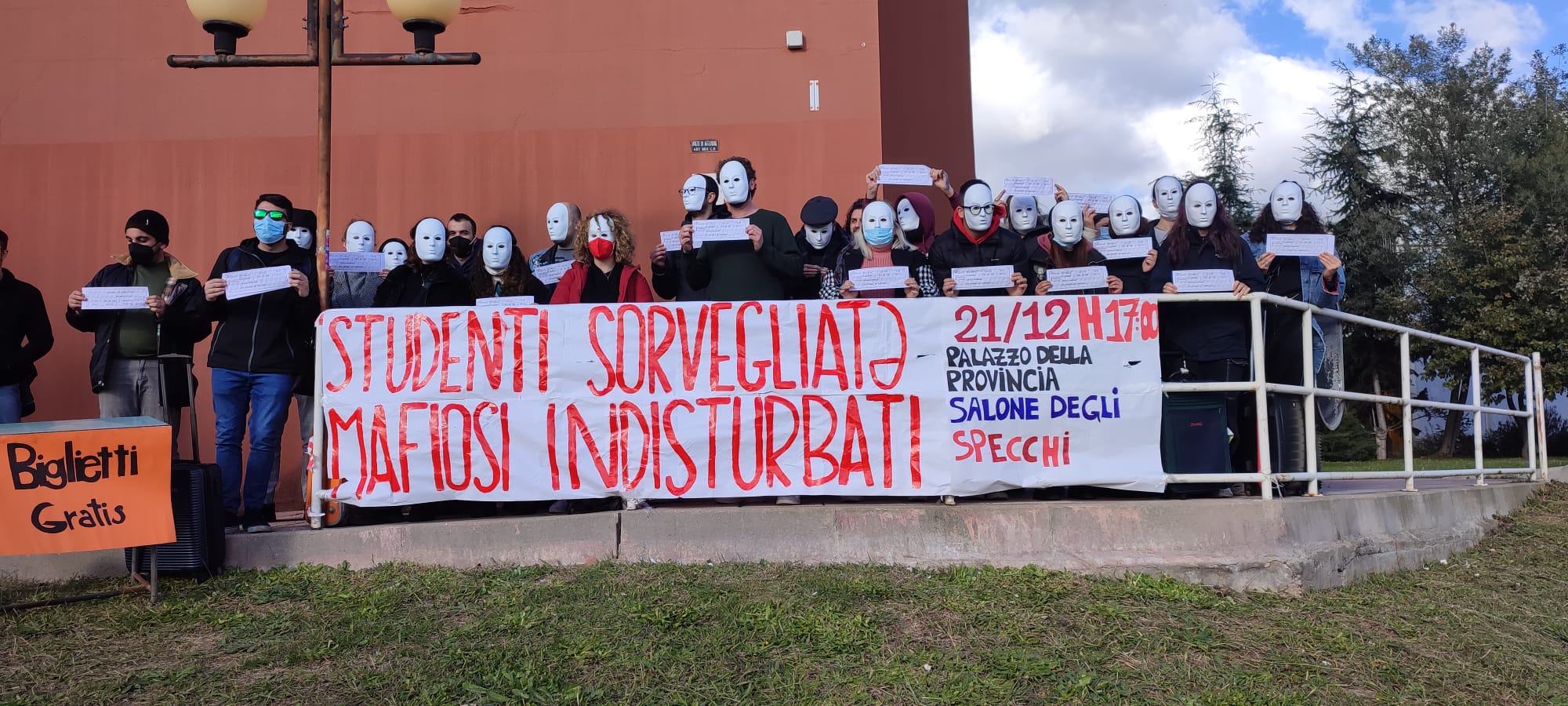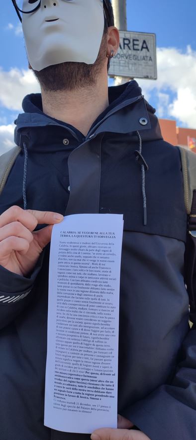 Siamo studentesse e studenti dell’Università della Calabria. Stamattina abbiamo voluto rappresentare la sorte che ci spetterebbe, in un prossimo futuro, se dovesse passare la sorveglianza speciale che la questura di Cosenza vorrebbe infliggere a due studenti dell’Università della Calabria: Jessica e Simone. Dietro quelle maschere non c’era nessuno, c’eravamo tutti: un’intera generazione e un’intera popolazione.