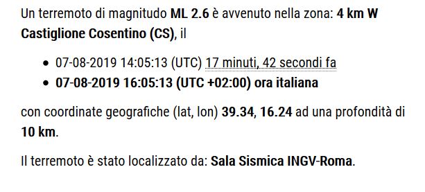 Un terremoto di magnitudo ML 2.6 รจ avvenuto nella zona: 4 km W Castiglione Cosentino (CS), il