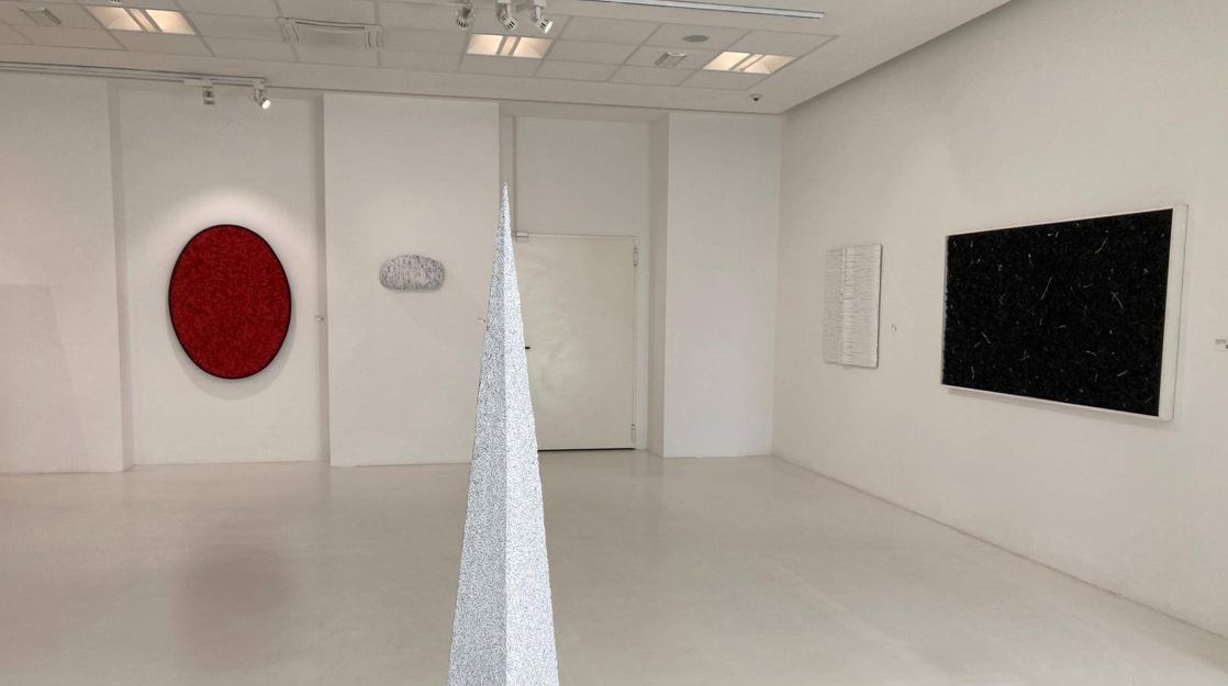 Altrettanto significativa l’installazione “Senza titolo giallo”, tecnica mista su carta e legno: composta da 15 elementi avvolti da scritte su carta in forma spiraliforme, l’opera crea un ritmo visivo fatto di pieni e vuoti, un moto circolare che ipnotizza e coinvolge. Lo spettatore viene assorbito da un turbinio di idee e pensieri, come dentro una corrente inarrestabile, dove inizio e fine si fondono in una tensione continua.