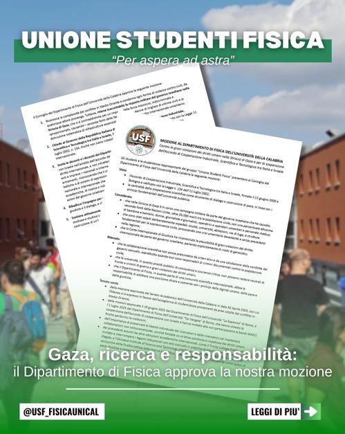 Il 31 luglio, in seduta ordinaria, il Consiglio di Dipartimento di Fisica dell’Università della Calabria ha discusso e approvato, con ampia maggioranza, la mozione presentata dagli studenti e dalle studentesse, rappresentanti del movimento Unione Studenti di Fisica (USF), rappresentato da Ludovica Giordano, Salvatore Giordano, Giusi Guarascio, Francesco Guarnaccia, Rossella Maria Lecce, Gabriele Sferrazzo
