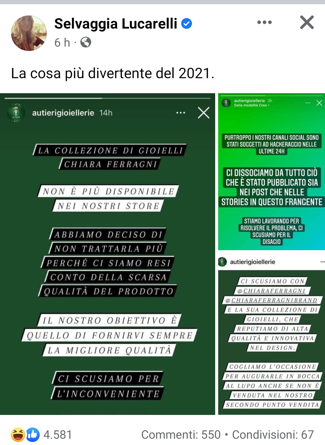 “E’ apparso sulle pagine social della gioielleria Autieri di Montalto Uffugo, con sede anche a Corigliano-Rossano, un messaggio che recita: “La collezione di gioielli Chiara Ferragni non è più disponibile nei nostri store. Abbiamo deciso di non trattarla più perché ci siamo resi conto della scarsa qualità”. Un paio d’ore e arriva un secondo post: “Purtroppo siamo stati hackerati””