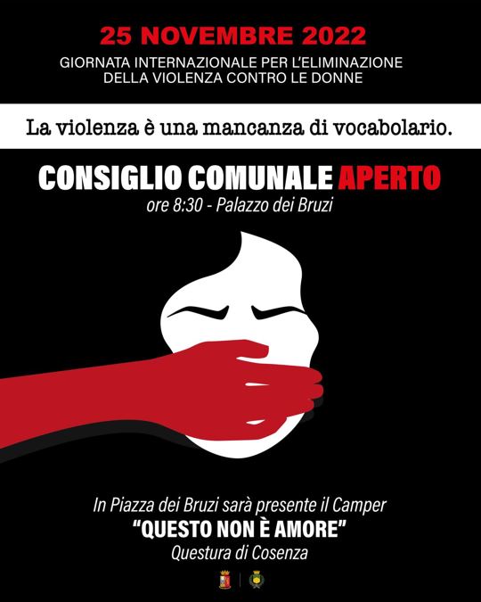 La Sala delle adunanze di Palazzo dei Bruzi ospiterà oggi, venerdì 25 novembre, alle ore 8,30, il Consiglio comunale aperto convocato in occasione della Giornata Internazionale per la eliminazione della violenza contro le donne