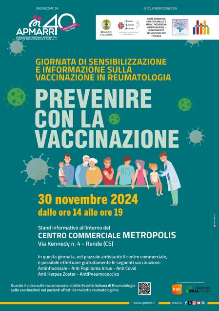 È questo l’obiettivo della giornata di sensibilizzazione e informazione organizzata da APMARR – Associazione Nazionale Persone con Malattie Reumatologiche e Rare APS ETS per sabato 30 novembre dalle 14 alle 19 presso il centro commerciale Metropolis di Rende (CS). L’appuntamento, promosso in collaborazione con il Servizio Sanitario Regionale – Dipartimento Tutela della Salute e Politiche Sanitarie della Regione Calabria, l’Unità Operativa Sanità Pubblica e Medicina Preventiva (ambito Rende) del Dipartimento prevenzione ASP di Cosenza, CFU – Italia Odv Comitato Fibromialgici Unitie Metropolis, rientra tra le attività del progetto “Prevenire con la Vaccinazione”, realizzato da APMARR su scala nazionale e dedicato all’informazione e alla sensibilizzazione delle persone con patologia reumatologica sull’importanza della vaccinazione, con il contributo non condizionante di GSK e Celltrion Healthcare.