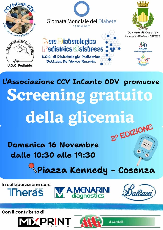 …ha organizzato la seconda edizione dello screening gratuito della glicemia, che si terrà domenica 16 novembre, dalle 10:30 alle 19:30, in Piazza Kennedy – Cosenza.