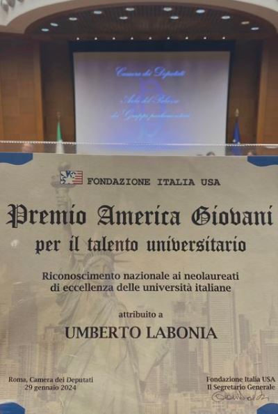 Lunedì 29 gennaio ha avuto luogo una cerimonia ufficiale di premiazione a Roma presso la Camera dei Deputati, durante la quale il giovane Umberto Labonia, di Mirto Crosia, ha avuto l’onore di ricevere il “Premio America Giovani” al talento universitario