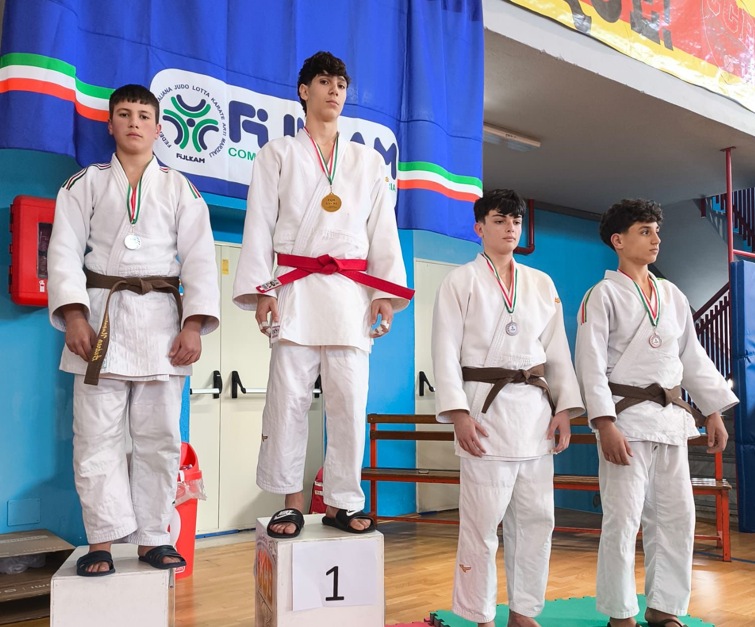 La foto del podio lo ritrae al centro della scena, sul secondo gradino, con la medaglia d’argento al collo e il judogi bianco impeccabile, affiancato dagli altri medagliati. Sullo sfondo, lo striscione della manifestazione e i colori vivaci della palestra raccontano l’atmosfera di una gara regionale intensa e partecipata, organizzata sotto l’egida della FIJLKAM (Federazione Italiana Judo Lotta Karate Arti Marziali).