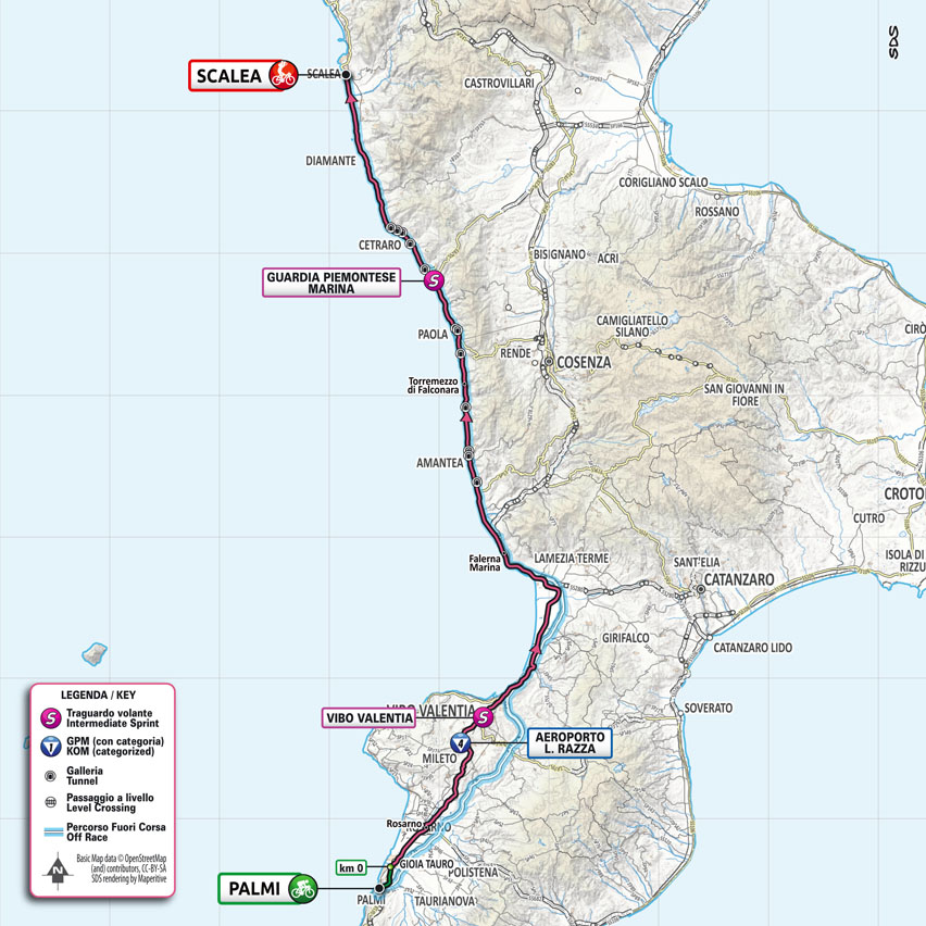 “Tappa non particolarmente impegnativa che si snoda essenzialmente lungo la strada a scorrimento veloce ss. 18 dalla carreggiata ampia caratterizzata dalla presenza di alcune gallerie. Unica leggera asperità di giornata la lunga e blanda salita dopo Mileto fino all’Aeroporto Razza di Vibo Valentia.