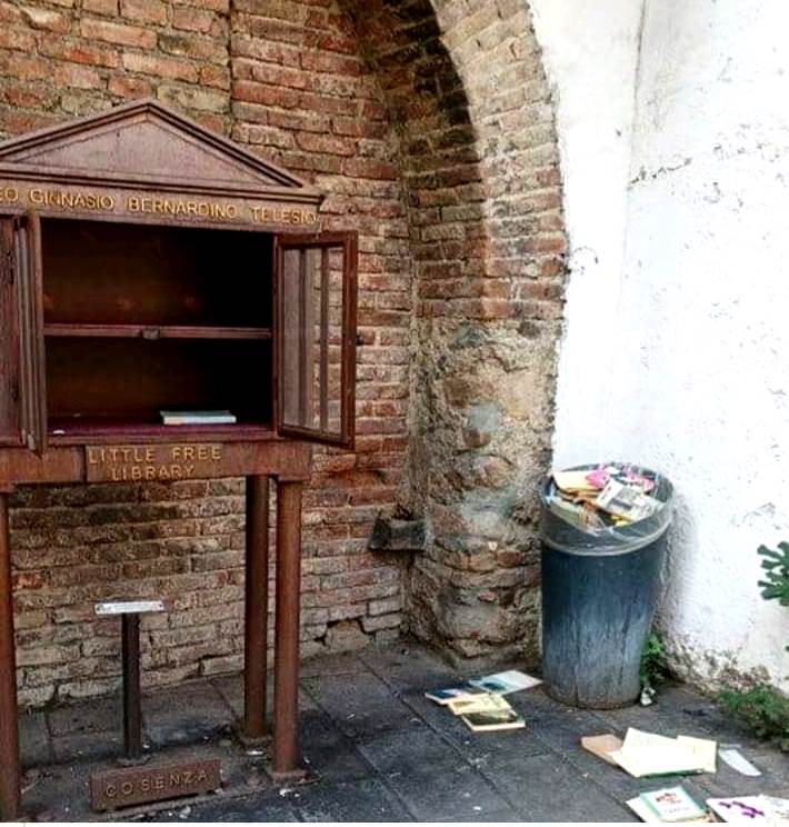 “Sbigottimento e costernazione per quanto è accaduto sul corso principale della Città di Cosenza, dove qualcuno, dopo che tanti cittadini avevano provveduto a riempire di libri la “Free Library” realizzata diversi anni fa dal Liceo Classico ‘Telesio’, la ha immediatamente svuotata gettando tutti i libri in un cassonetto della spazzatura ubicato nelle adiacenze.