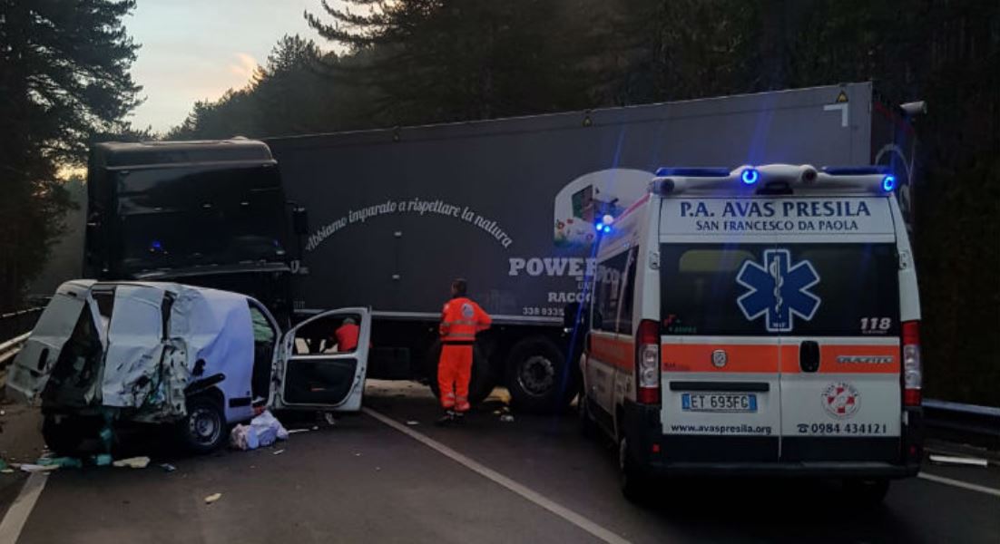 Lo scontro ha riguardato un autotreno e un furgoncino. Statale 107 interdetta al transito