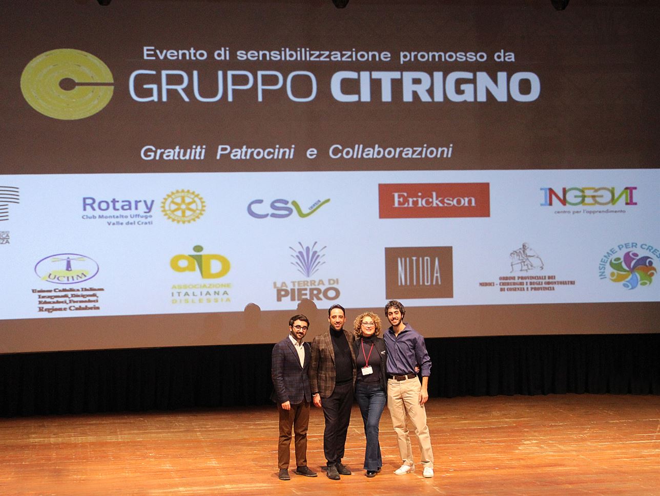 Il Gruppo Citrigno che ha visto nell’Associazione un grande operato, ha deciso di sponsorizzare lo spettacolo organizzato dalla Presidente dell’Associazione Teresa D’Andrea e andato in scena ieri sera al Cinema Teatro Garden. Il monologo dell’attore e scrittore Francesco Riva “Dislessia, dove sei Albert” ha raccontato in modo brillante e ironico la dislessia che in Italia caratterizza quasi centonovantamila studenti. In Calabria, riconosciuti, sono solo 3mila circa, ma secondo le stime di molti sono almeno 13mila i bambini che hanno questo disturbo. La differenza è data dai fattori che indicavamo prima e che hanno generato moltissimo “sommerso”. Da qui la necessità di sensibilizzare istituzioni e popolazione a queste tematiche.
