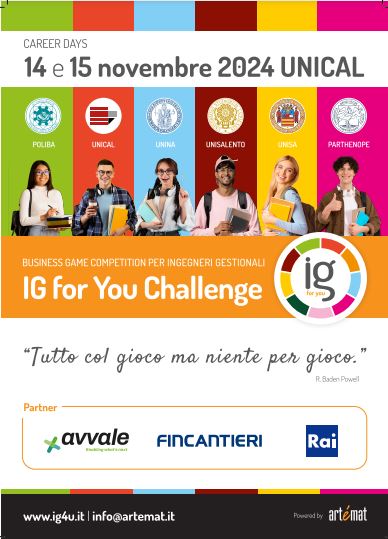 Il Corso di Studi in Ingegneria Gestionale dell’Unical ospiterà l’undicesima edizione dell’IG For You Challenge, competizione dedicata ai migliori laureandi e neolaureati in Ingegneria Gestionale del Sud Italia. L’edizione 2024, che si terrà il 14 e 15 novembre presso il campus universitario, vedrà la partecipazione di sei università italiane: l’ateneo ospitante e cinque altri prestigiosi istituti, tra cui il Politecnico di Bari, l’Università di Napoli Federico II, l’Università Parthenope, l’Università di Salerno e l’Università del Salento.