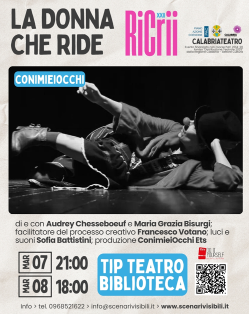 La Donna che ride sarà presente al Tip Teatro all’interno di RICRII 2025-26, la stagione di teatro contemporaneo di Scenari Visibili arrivata alla sua XXII edizione, che prende spunto dal termine “ricriiarsi”, divertirsi, il cui obiettivo è programmare proposte alternative ai soliti canoni, in un territorio complicato e a volte culturalmente emarginato.