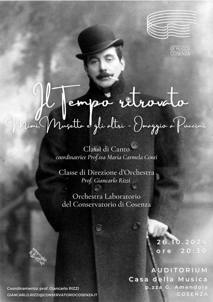 Sabato 26 ottobre, alle 20 e 30, presso l’Auditorium – Casa della Musica, le classi di Canto, (coordinate da Maria Carmela Conti); la classe di Direzione d’Orchestra (coordinata da Giancarlo Rizzi) e l’Orchestra Laboratorio del Conservatorio di Cosenza omaggeranno Giacomo Puccini con un programma dal titolo Il tempo ritrovato Mimì, Musetta e gli altri in cui saranno eseguite arie tratte da La Bohème e la Sinfonia n. 1 di Georges Bizet.