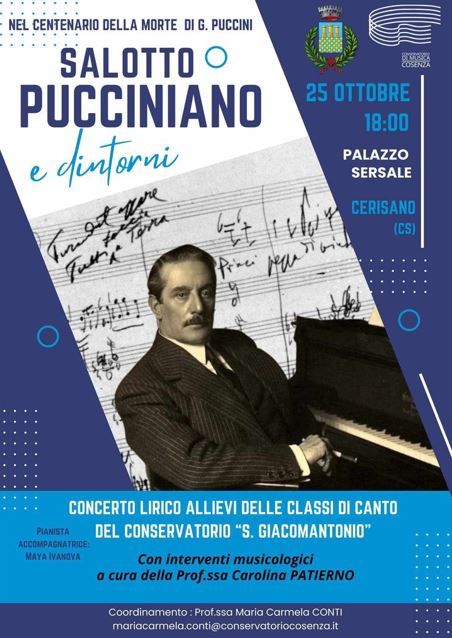 Venerdì 25 ottobre, alle 18, presso Palazzo Sersale a Cerisano (CS), sarà la volta del Salotto Pucciniano, ovvero il Concerto lirico degli allievi delle classi di Canto – coordinati da Maria Carmela Conti – con interventi musicologici a cura di Carolina Patierno. Il programma prevede celebri arie di Giacomo Puccini: Quando men’vo, O Mimì tu più non torni (da La Bohème); O mio babbino caro (da Gianni Schicchi); Signore ascolta (da Turandot); E lucevan le stelle (da Tosca); “Coro a bocca chiusa” (da Madama Butterfly); Sole e amore; È l’uccellino. Ma non solo, Serenata, M’ama non m’ama di Pietro Mascagni; Lasciati amar, Musetta svaria (da La Bohème) di Ruggero Leoncavallo.