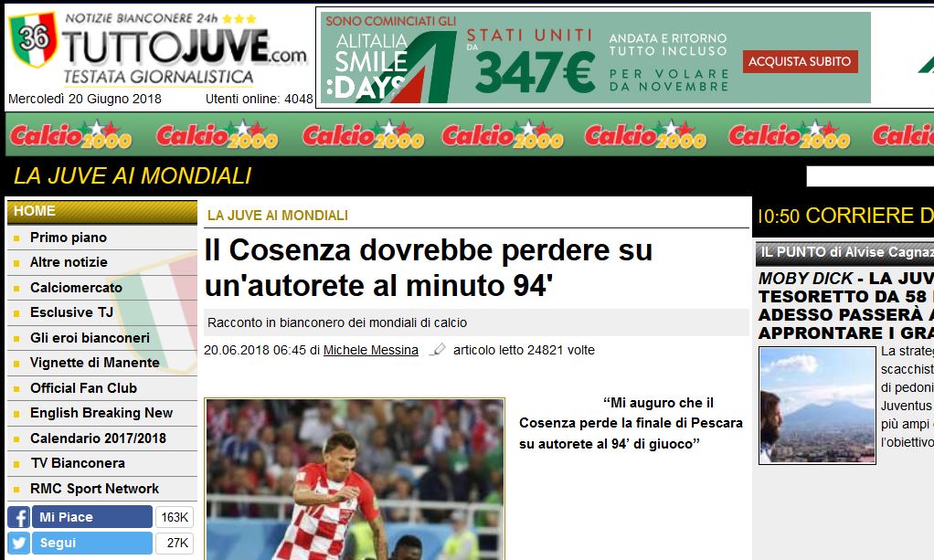 E’ questo il titolo di un articolo apparso questa mattina sul sito “Tutto Juve”, che in realtà parla dei giocatori juventini impegnati al mondiale in Russia. Infatti nell’articolo non si tratta in nessun modo il tema del Cosenza e della finale Playoff.