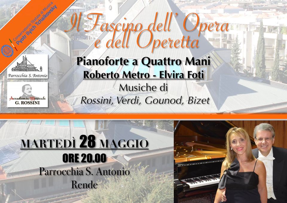 Concerto organizzato dal Conservatorio Tchaikovsky di Nocera/Catanzaro in collaborazione con l’ Accademia Musicale G. Rossini (di Rende e Cosenza), si esibiranno i maestri Roberto Metro ed Elvira Foti regalando al pubblico un’esperienza indimenticabile attraverso le più belle pagine dell’Opera Italiana e non solo.