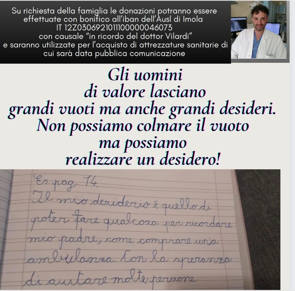 Per chi volesse partecipare, le donazioni potranno essere effettuate tramite bonifico all’iban dell’Ausl di Imola IT12Z0306921011100000046073 con causale “in ricordo del Dottore Vilardi” .