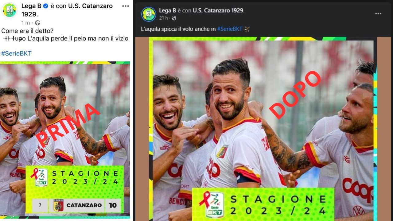 “La Lega di Serie B, sui propri canali social ufficiali, per celebrare il momento d’oro della squadra del capoluogo di regione, ha pubblicato un post con una foto dei giocatori del Catanzaro che esultano scrivendo nella didascalia: «Come era il detto? L’aquila (simbolo del Catanzaro) perde il pelo ma non il vizio». Nel post è stata anche barrata la parola “lupo” (simbolo del Cosenza) prima della frase per intero.”