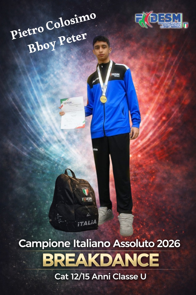 Tra i protagonisti della rassegna emerge il giovanissimo Pietro Colosimo, in arte “Bboy Peter”, atleta tesserato con l’A.S.D. Telemare Dance School di Paola, del Maestro federale Francesco De Luca, che ha conquistato il 1° posto nella disciplina Breaking, categoria Junior (12-15), Classe U, laureandosi Campione Italiano Assoluto 2026.