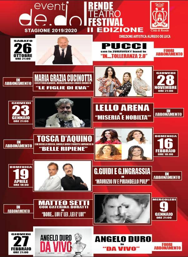 Stagione Teatrale ricca di spettacoli presentata dalla Dedo Eventi di Alfredo De Luca, attesa a breve la data della conferenza stampa insieme al sindaco Manna e l’ufficio stampa del Comune di Rende. Gli abbonamenti al Rende Teatro Festival si possono acquistare nella biglietteria ufficiale della rassegna Inprimafila di Cosenza.”