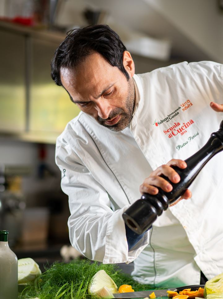 Formatosi nella Scuola di Alta Cucina di Gualtiero Marchesi, per anni allievo prediletto di Alain Ducasse e, dal 2017, Ambasciatore della Dieta Mediterranea nel mondo, Pietro Parisi ha aderito all’Alleanza Slow Food dei Cuochi ed ha ottenuto una lunga serie di premi internazionali, tra cui quello come “Testimone di diritti umani conferitigli dalla Lunid” (Libera Università dei diritti umani).