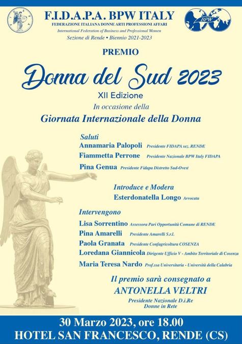 Giovedì 30 marzo a Rende sarà consegnato il premio “Donna del Sud” ad Antonella Veltri, presidente nazionale d.i.re ,dalla f.i.d.a.p.a. (federazione italiana donne arti professioni affari)