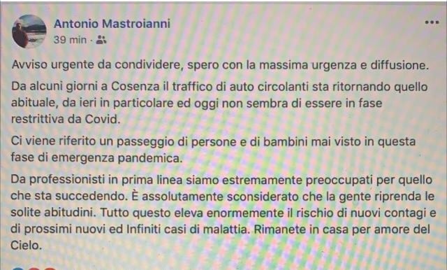 In tantissimi già da lunedì ci state segnalando l’aumento di persone che stanno circolando per la città. Ha avuto questa sensazione anche il Dott. Antonio Mastroianni, Primario di malattie infettive dell’Azienda Ospedaliera di Cosenza, che ha pubblicato sul suo profilo Facebook l’appello da condividere: