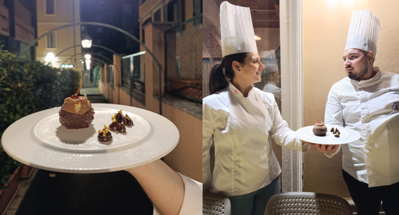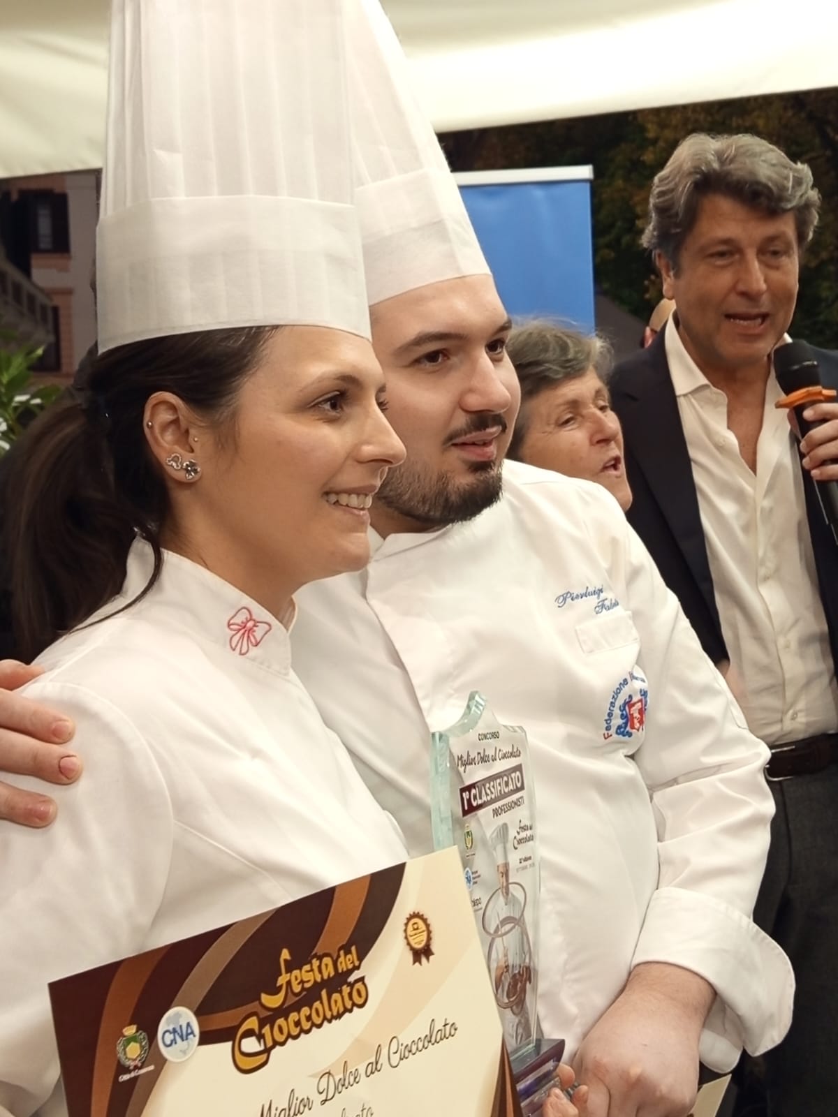 A trionfare nella loro categoria sono stati i due giovani fratelli Falsetta, Federica e Pierluigi, con il loro “Rochèr Prezioso”; una sfera di semifreddo al Nerone puro, con cuore alla nocciola, glassa specchio al cioccolato al latte, mulinello goloso e stalattite di nocciola caramello.