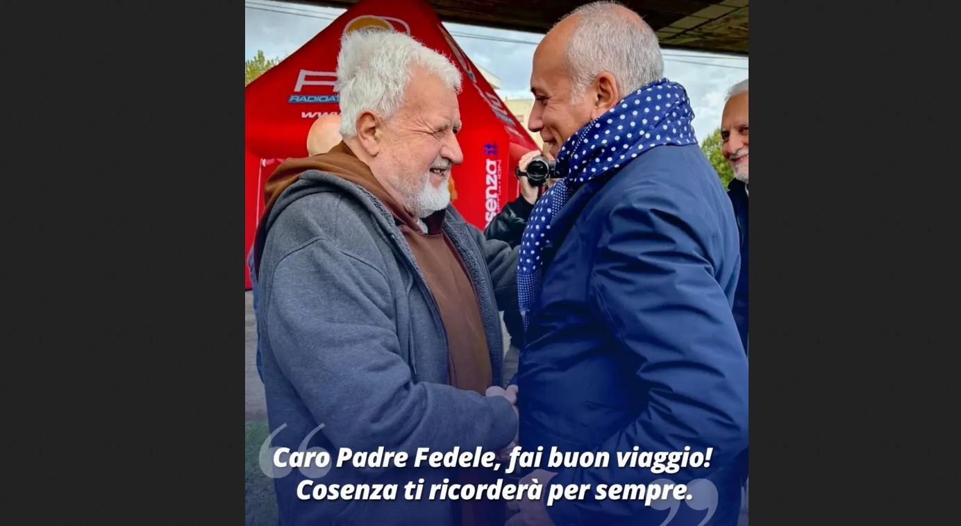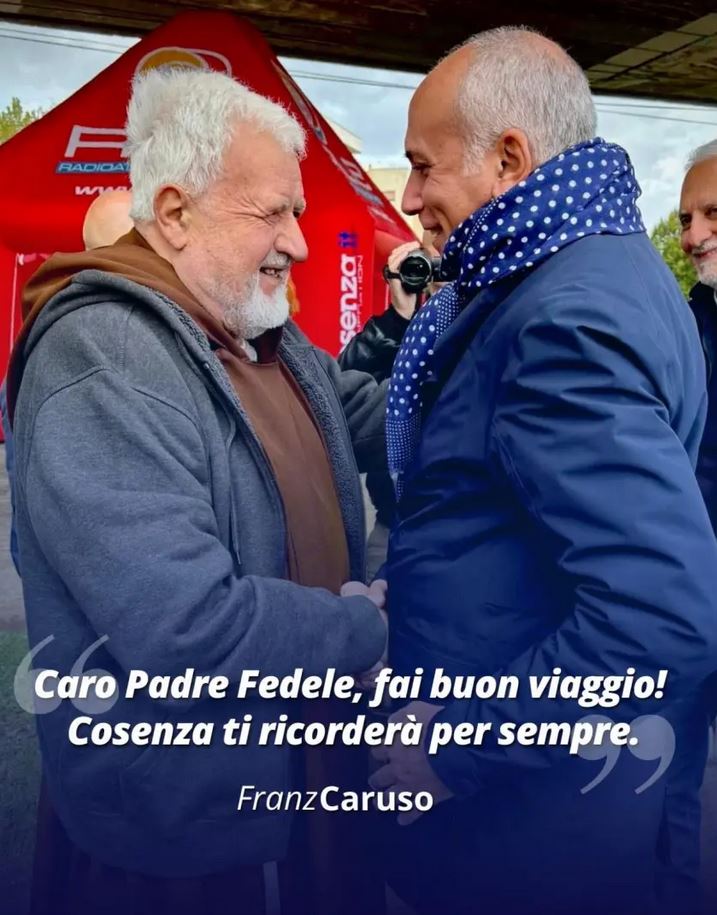 “Oggi – ha scritto Franz Caruso – è una triste giornata per la città di Cosenza. La scomparsa di Padre Fedele ci mette di fronte alla realtà di una grande perdita per tutti i cosentini e soprattutto per tutti coloro – gli ultimi, i senzatetto, gli extracomunitari, le persone fragili- che, grazie alla sua opera di grande altruismo e generosità, si sono sentiti accolti, hanno trovato una casa e quel calore umano che altrimenti non avrebbero avuto.